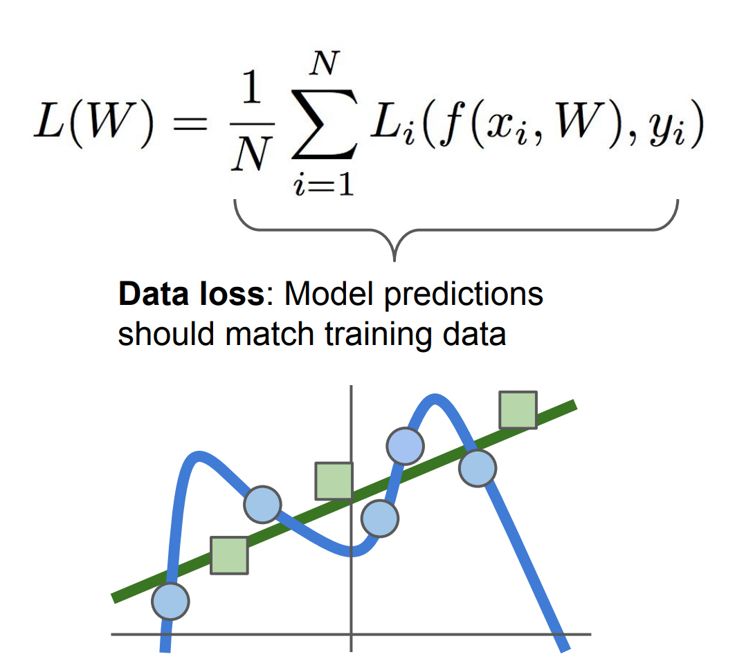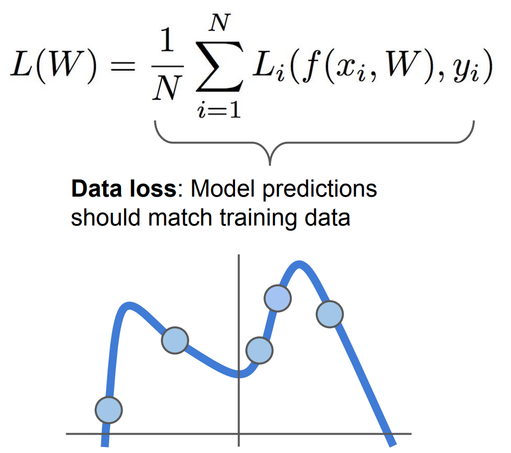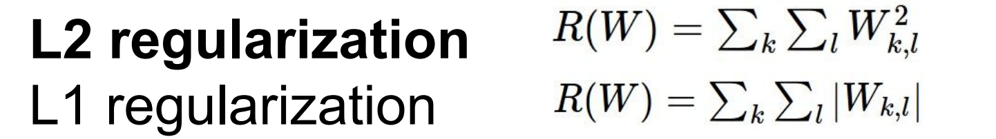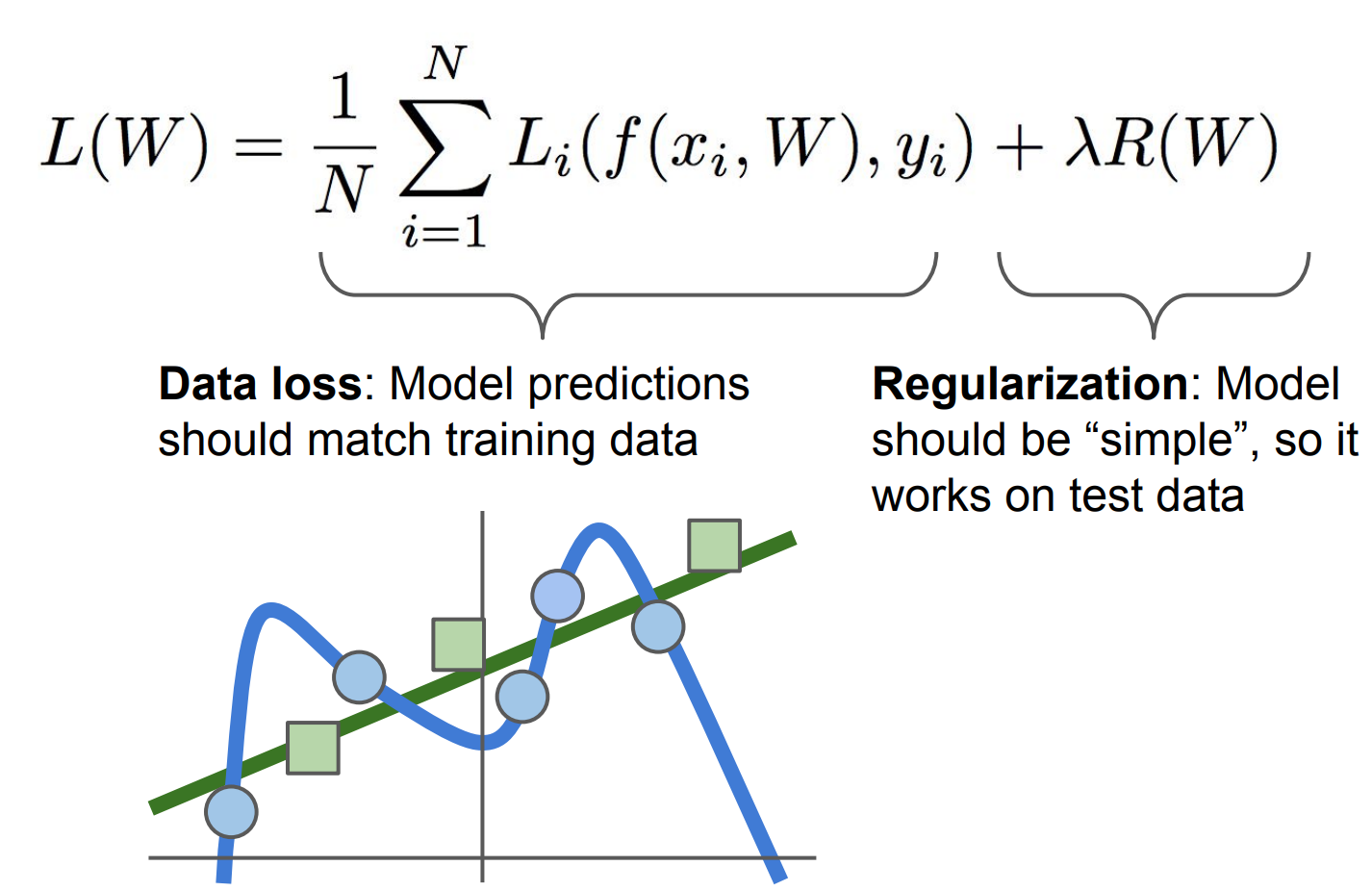 기존 Loss 식에 변화를 주어야 된다. 기존 식에Regularization을 추가하여 이 식은 분류기가 더 간단한 W를 선택하도록 패널티를 주는 역할을 한다.