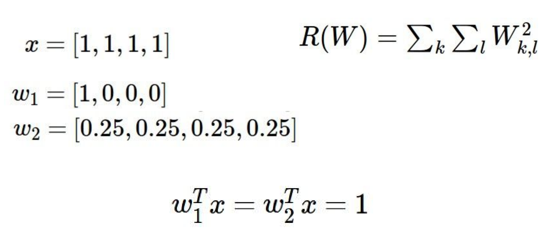 L2는 x의 모든 다른 값에 W의 영향들을 분산시키는 것을 선호한다. 따라서 값이 분산되어있는W2를 더 선호하게 된다.- 따라서 최종 분류기는 모든 입력 차원을 소수의 입력 차원보다 작은 양으로 매우 robust하게 고려하도록 권장된다.