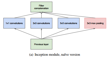 naive Inception module이다. Filter들의stride와padding을 통하여 입력과 출력 차원을 일치시키고 depth를 높였다.