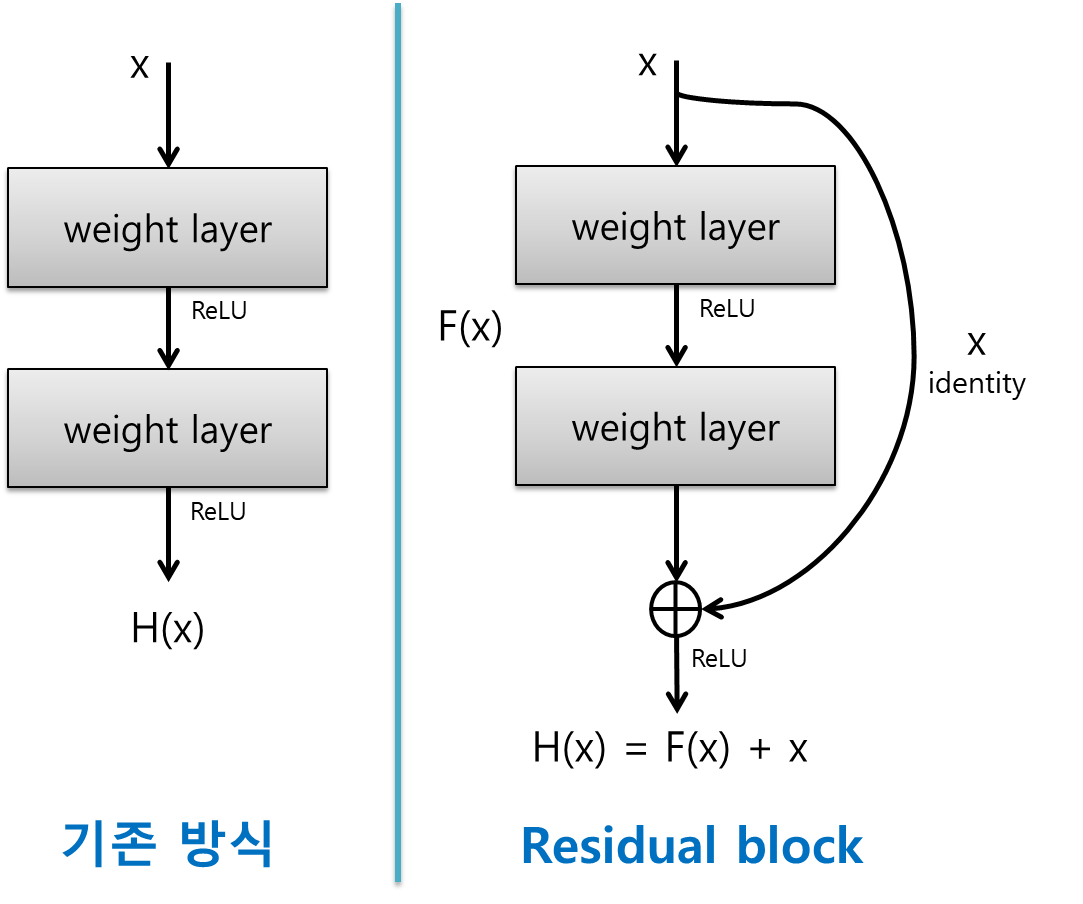 - 모델이 학습을 할 때 $H(x)$를 하는 것이 아니라 x를 뺀 나머지(잔차 $F(x)$)를 학습을 하게 된다.