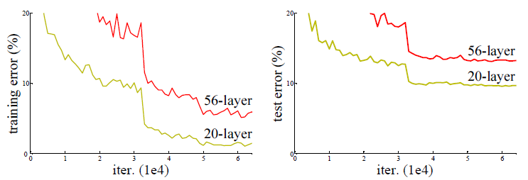 optimization problem이다. 적어도 깊은 layer는 shallower의 성능은 기본적으로 있어야 하지만 그 조차도 아니다.- 깊은 layer는 shallower model보다 최적화 하기 어렵다.