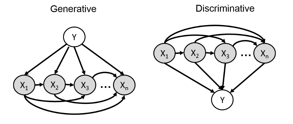 생성 모델과판별 모델을 노드로 관계를 나타낸 것이다.생성 모델은 x,y사이의 전체 관계($p(x,y) = p(x|y)p(y)$)를나타내고판별 모델은 주어진 x에 대해 y를 바로 예측($p(y|x)$)을 한다.