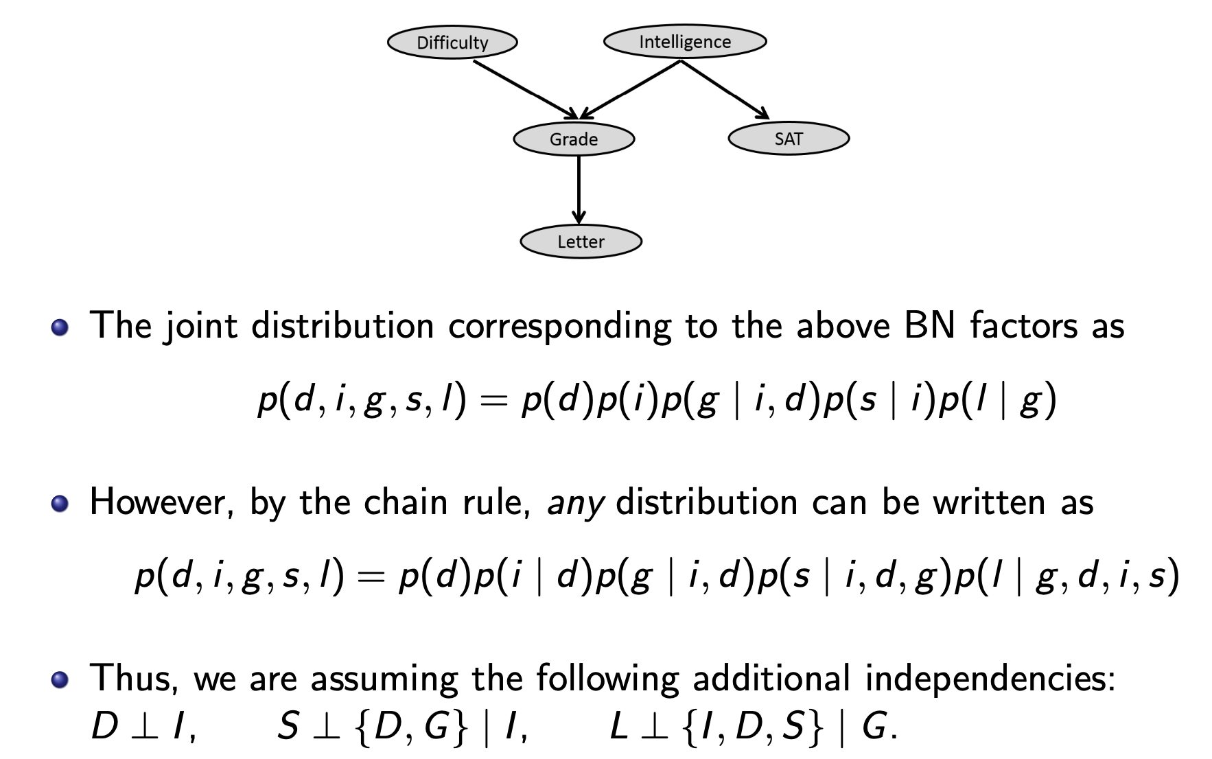 - $p(x_1, x_2, \ldots, x_n) = \prod_{i \in V} p(x_i \mid x_{\text{Pa}(i)})$