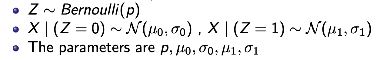 첫번째 모델은Mixture of 2 Gaussian이다. 베르누이 분포에서 뽑은(2가지 경우) z에 해당하는 분포에서 X를 샘플링을 한다.