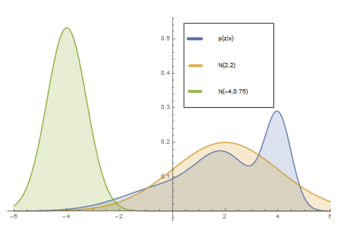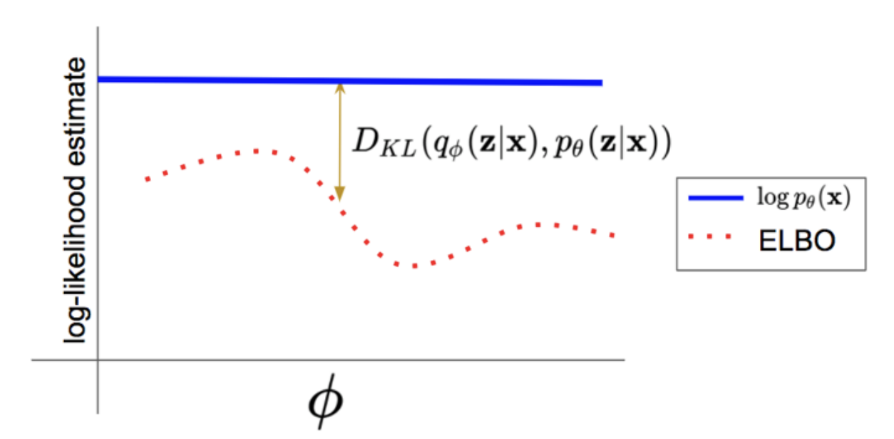 파란색: p(z|x)분포가 있으면, 이것에 최대한비슷한 가우시안 분포를 찾으려고 하는 것이다. 이걸 vae 관점으로 생각해보면 비슷한 가우시안 분포를 찾을 때 parameter $\phi$ 를 사용하여 최적화 하는 것이다.