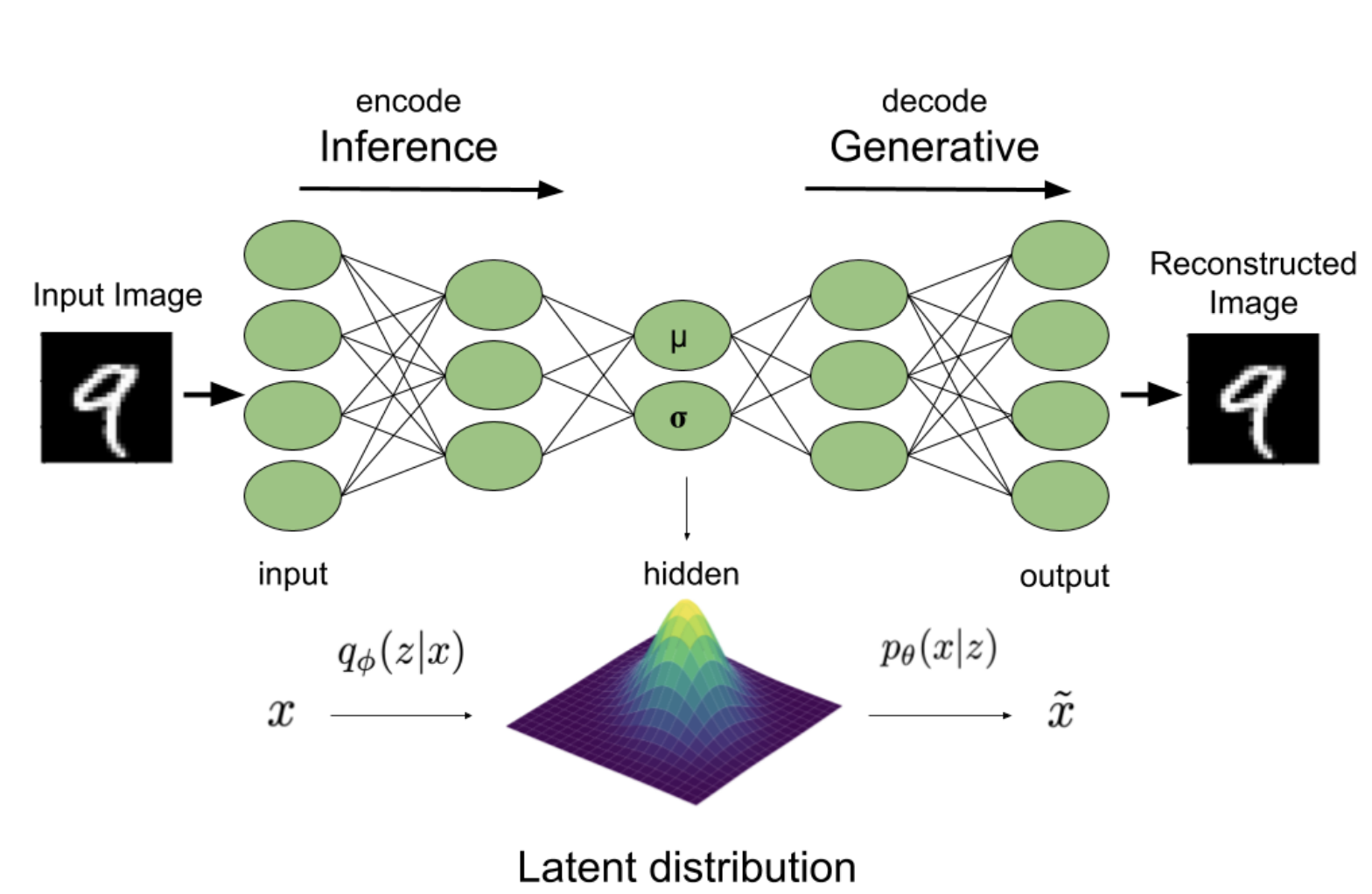 variational posterior를 추론하는neural network라고 배웠다. - 그렇다면 encoder는 이미지(x)를 보고 이미지에 맞는 latent variable z의 분포, 즉 평군과 분산의 값이 나오고 이를 샘플링하여 특정 z의 값을 얻는 것이다.