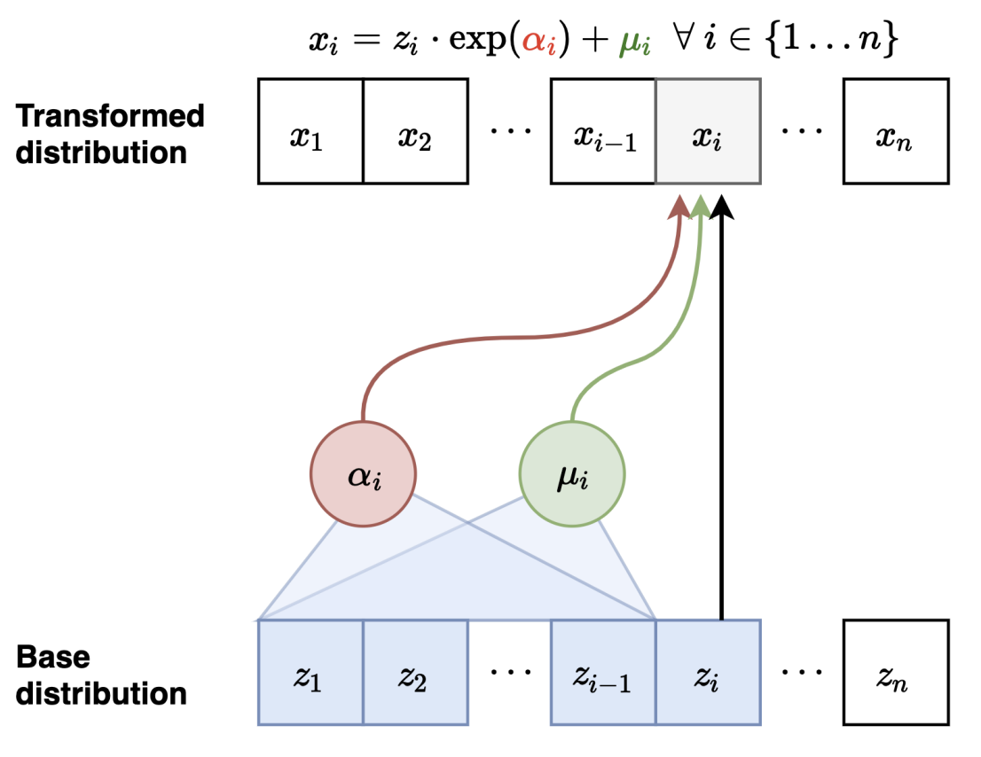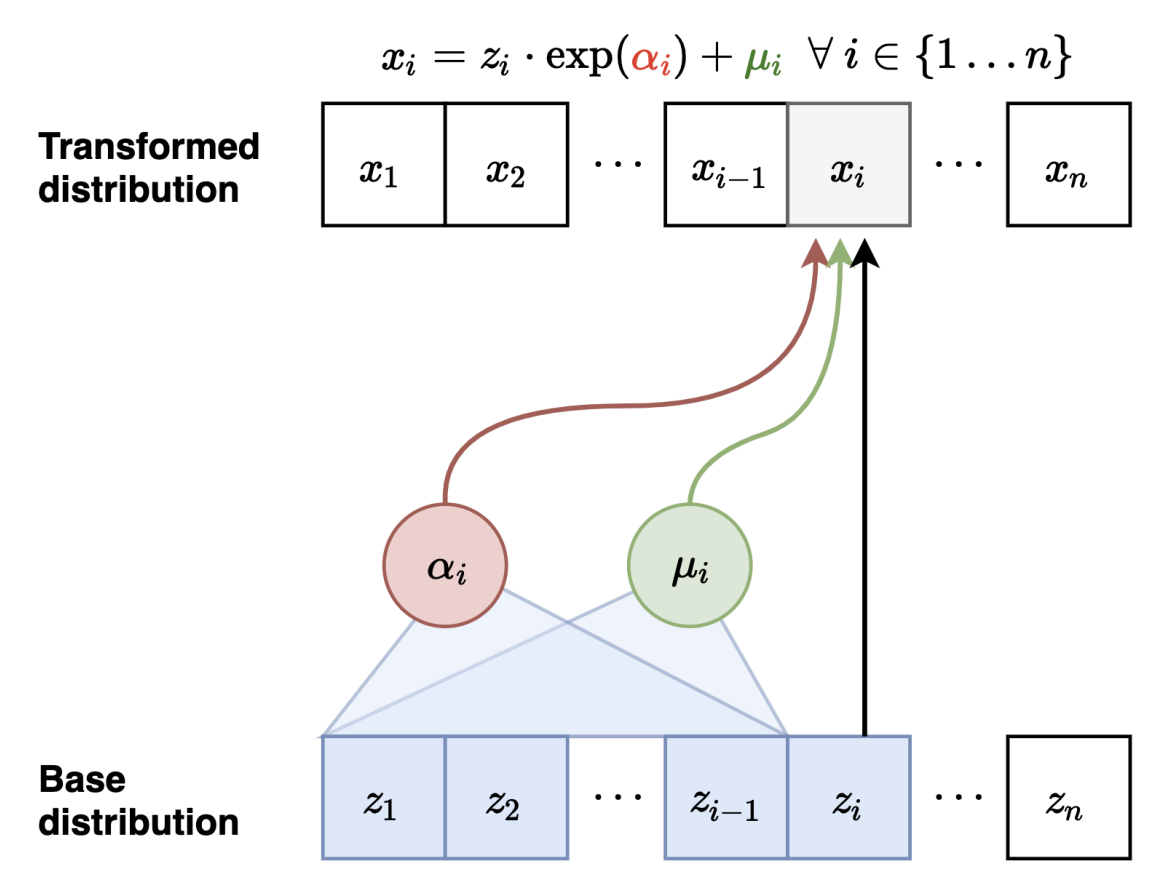 $$p(\mathbf{x}) = \prod_{i=1}^n p(x_i \mid \mathbf{x_{<i}})$$ $$p(x_i \mid \mathbf{x_{<i}}) = \mathcal{N}\big(\mu_i(x_1, \cdots, x_{i-1}), ; \exp(\alpha_i(x_1, \cdots, x_{i-1}))^2\big)$$