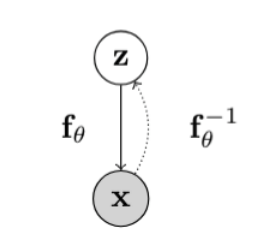 latent variable이긴 하지만, VAE의 z와 같은 역할을 한다고 볼 수는 없다.Normalizing Flow에서 z는 x와 차원이 같기 때문이다. - 이 과정을 하기 위해서는 $f_\theta$ 를 invertible하고 jacobian 행렬 계산이 용이하도록 parameterized 해야한다. (여러 모델들을 보면서 어떻게 parameterized가 되는지 살펴볼 것이다.)