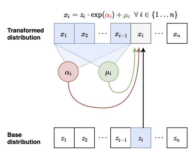 $$p(\mathbf{x}) = \prod_{i=1}^n p(x_i \mid \mathbf{x_{<i}})$$ $$p(x_i \mid \mathbf{x_{<i}}) = \mathcal{N}\big(\mu_i(x_1, \cdots, x_{i-1}), ; \exp(\alpha_i(x_1, \cdots, x_{i-1}))^2\big)$$