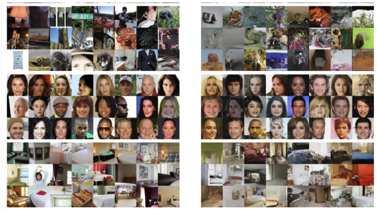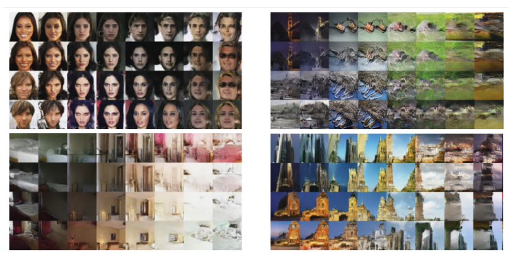 Real-NVP는Volume Preserving Transformation을 만족하지 않고 더욱 유연한 모델이라고 볼 수 있다. 그리고Real-NVP에서latent variable z에 대한 보간 실험도 했다. 아래 실험 결과를 보면latent variable z가 압축적이지 않더라도 보간을 하면 의미 있는 결과를 얻는 것을 확인 할 수 있다. 아래는Real-NVP의 모델 실험 결과와 보간 실험이다