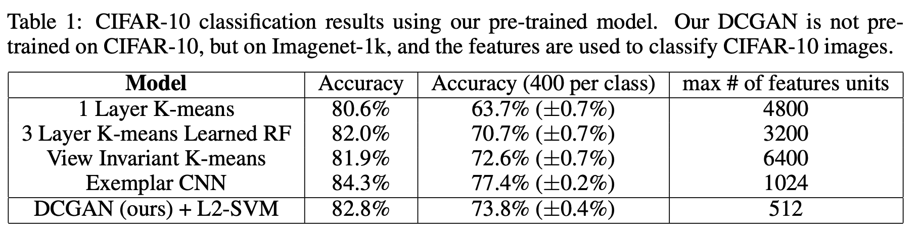 DCGAN또한 represent를 잘 학습했는지 평가하기 위하여CIFAR-10데이터를 이용하여 실험을 수행하였고,discriminator로부터4x4 grid feature를 뽑아낸 다음,28,672크기의 벡터로 전환하여L2-SVM 모형을 훈련시켰다.