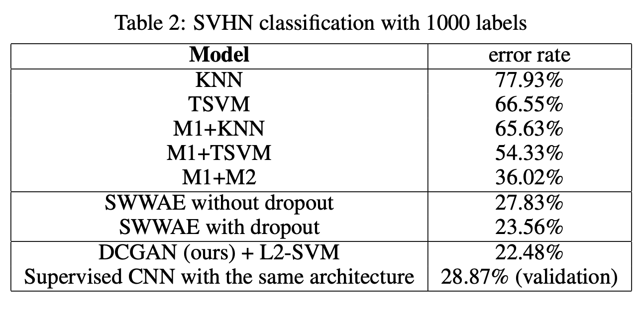 StreetView House Numbers(SVHN)으로 같은 방법으로 성능을 내었을 때위 그림처럼SOTA를 달성하여Supervised CNN보다 더 준수한 성능을 보여서 본 논문에서는DCGAN에서의main key가 그저 CNN 아키텍처라고만 할 수는 없다고 알려준다.