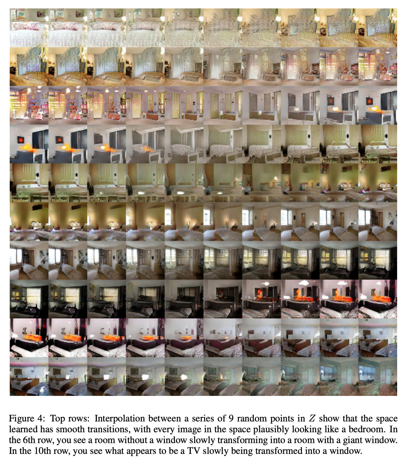 DCGAN을 이용한 여러 실험을 보여준다.첫 번째 실험으로Walking in the latent space이다. 이 실험은 정말generator가 학습 데이터를memorize를 하지 않았다는 것을 보여준 실험이다.