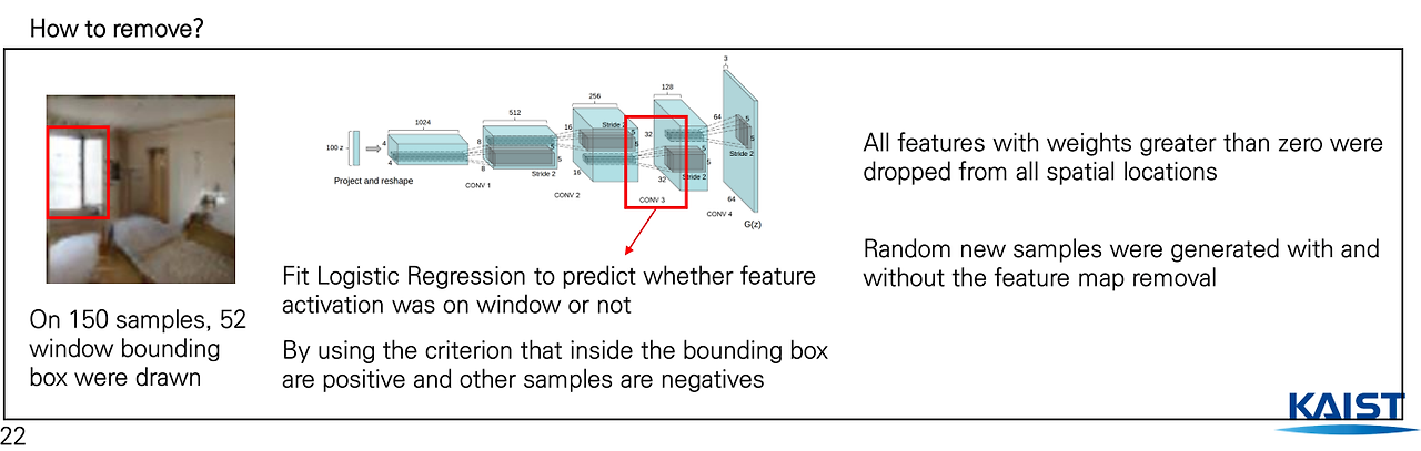 위 왼쪽의 그림처럼제거할 창문(객체)에bounding box를 그린다. 그 다음으로 Generator의 두번째 끝단의 네트워크에서Logistic Regression을 훈련시켜서 bounding box 내부는 양수고 바깥은 음수가 나오는 경우, 즉 다른 말로 해당 부분에 대해서가중치가 양수 값(bounding box 내부)을 갖는 모든 경우는 drop을 시킴으로써 제거를 한다.