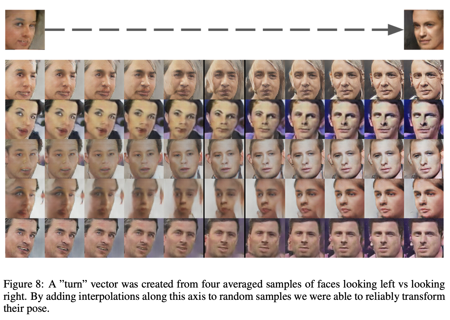 generator가 단순히 이미지를 무작위로 생성하는 것이 아니라latent vector의 변화에 따라이미지의 특정 속성(얼굴의 방향 등)을 조절할 수 있는 능력을 가지고 있다는 것을 알 수 있게 된다.