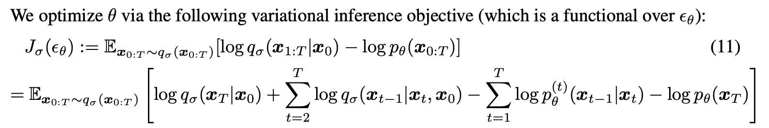 fixed prior인 $ p_{\theta}(x_T) = \mathcal{N}(0, I)$를 통해 generative process를 아래와 같이 정의할 수 있다. $$p_{\theta}^{t}(x_{t-1} | x_t) = \begin{cases} \mathcal{N}(f_\theta^{1}(x_1), \sigma_1^2 I) & \text{if } t = 1 \\ q_\sigma(x_{t-1} | x_t, f_{\theta}^{t}(x_t)) & \text{otherwise} \end{cases} $$
