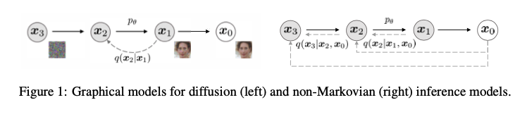 DDPM은Markovian의 특성을 가지고 있지만,DDIM은Non-Markovian의 특징을 가지고 있다는 것을 알 수 있다.