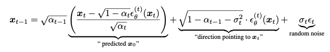 $$q_{\sigma}(x_{t-1} | x_t, x_0) = \mathcal{N} \left( \sqrt{\alpha_{t-1}} x_0 + \sqrt{1 - \alpha_{t-1} - \sigma_t^2} \cdot \frac{x_t - \sqrt{\alpha_t} x_0}{\sqrt{1 - \alpha_t}}, \sigma_t^2 I \right)$$