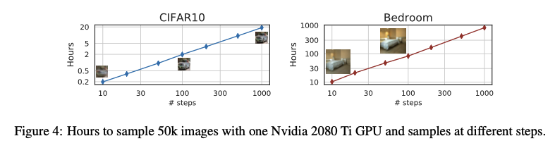 DDPM과 같은 모델들은 샘플을 생성하는데많은 반복이 필요하다는 것이 문제점이다. 따라서GAN에 비하여 속도가 매우 느리다.