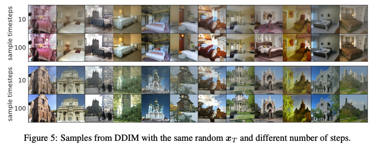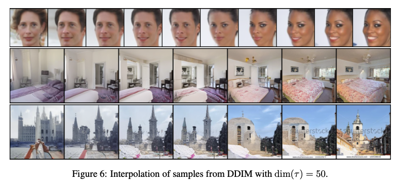 DDPM과 비교하여 더 뛰어난 샘플 품질을 제공한다. DDIM에 일관성 속성이 있기 때문에초기 latent variable에서 출발하여높은 수준의 특징을 공유하게 된다.초기 latent variable을 조작하여 의미적으로 유의미한 이미지 보간을 수행할 수 있다.