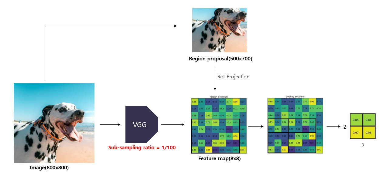 CNN에통과시킨 후 나온feature map에이전에 생성한RoI를projection시키고, 이RoI를FC layer input크기에 맞게 고정된 크기로 변형할 수가 있다.