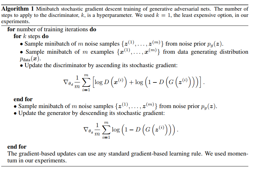 - $D$를 최적화 하는 단계를 k번 반복하고, $G$를 최적화하는 단게를 한 번 수행하게 된다.