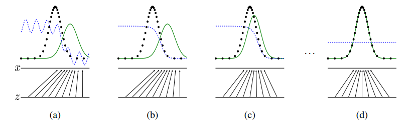 z->x로 향하는 화살표들은mapping x = G(z)가non-uniform한 분포p_g를transformed samples로 변경하게 된다.