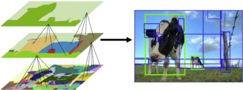Selective Search란 색상, 질감, 영역크기 등을 이용해non-objective segmentation을 수행한다. 이 작업을 통해좌측 제일 하단 그림과 같이 많은 small segmented areas들을 얻을 수 있다.Bottom-up방식으로small segemented areas들을 합쳐서더 큰 segemented areas들을 만든다.두 번째의 작업을 반복하여 최종적으로2000개의region proposal을 생성한다.