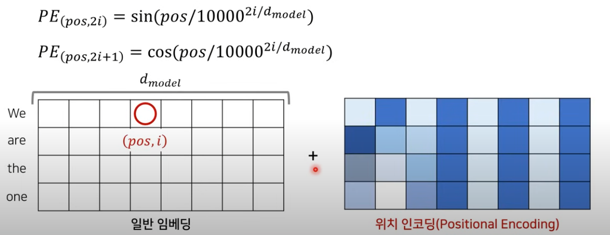 Transformer에서는RNN을 사용하지 않고attension mechanism만 사용하기 때문에 input data에 대한 위치 정보를 포함하고 있는 임베딩을 사용해야 한다.