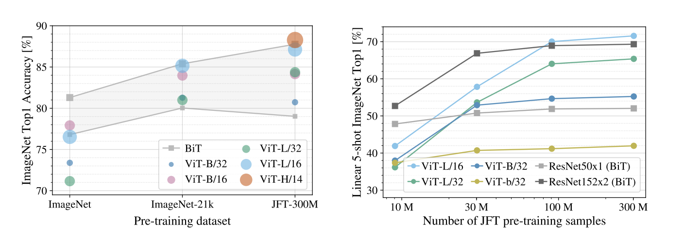 - 그러나 더 큰 데이터 셋으로 훈련을 했을 경우 모델의 성능이 크게 향상이 된다. 따라서 대규모 훈련이 inductive bias를 능가하는 것을 확인을 하였다.
