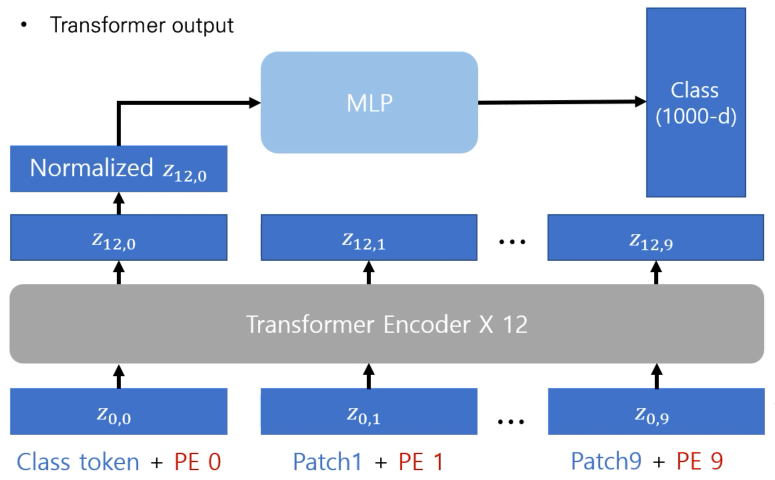 - 즉, 최종 output으로 이 token이 나왔을 때 이미지에 대한 1차원 representation vector로써의 역할을 수행하게 된다.